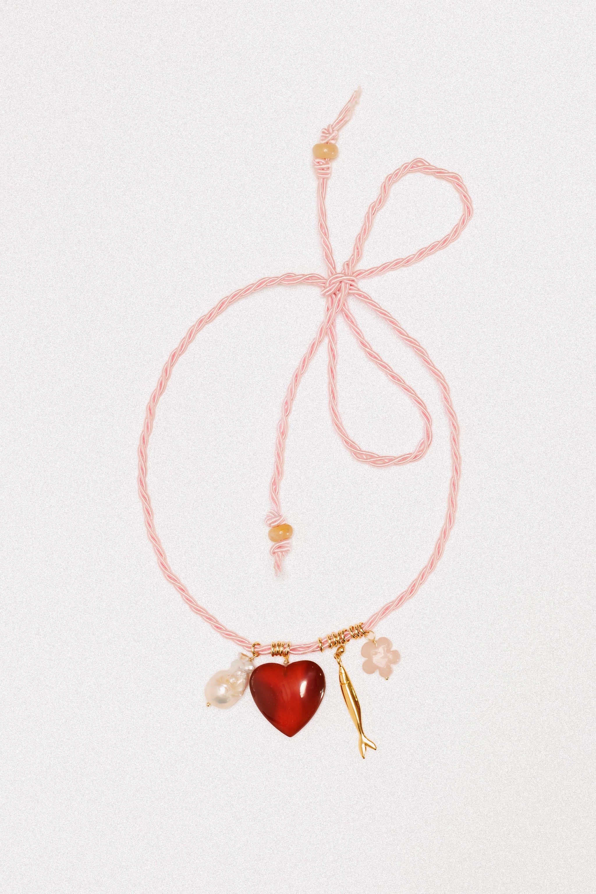 Apportez une touche symbolique à votre style avec ce collier orné de charms délicats en pierres semi-précieuses. Un cœur, un poisson, une fleur, une perle d‘eau. Chaque pierre est soigneusement choisie pour ses nuances uniques et son énergie, tandis que la corde tressée apporte de la couleur et de la vibrance. Les poissons, symboles de liberté et de fluidité, ajoutent une dimension spirituelle à ce bijou original. Le petit plus, le magnifique cœur de cornaline a été chiné avec amour.